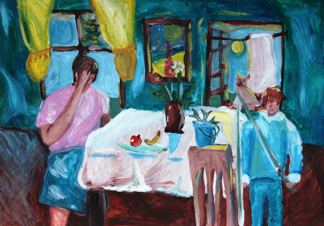 Ранним утром мама с сыном накрывали на стол. Мама поставила на белоснежную скатерть вазу с цветами, налила в кувшин компот, на тарелку разложила фрукты. Папа уже заканчивал умываться, а сын всё поглядывал в окно мечтая поскорее отправится на природу. Дружно позавтракав, мама стала собираться на работу – доить коров. Папа уехал на тракторе, а мальчик побежал на речку с друзьями купаться и ловить рыбу. Вечером он весь улов отдаст маме и на ужин она приготовит вкусную уху!