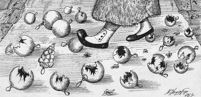 Шары аккуратно разложены на цветастой тряпке. Возле них продавец – сосед по квартире. Увидев бабушку, он краснеет и пытается что-то ей объяснить. Не слушая его, Мария Памфиловна молча топчет галошами хрупкое ёлочное стекло. И когда на тряпке ничего, кроме радужных осколков, не остаётся, так же молча поворачивается и уходит. “Задержать её надо! Чего ж ты, мужик, молчишь?! Сейчас милиционера кликнем!” – галдит ошарашенная учинённым разгромом базарная публика.