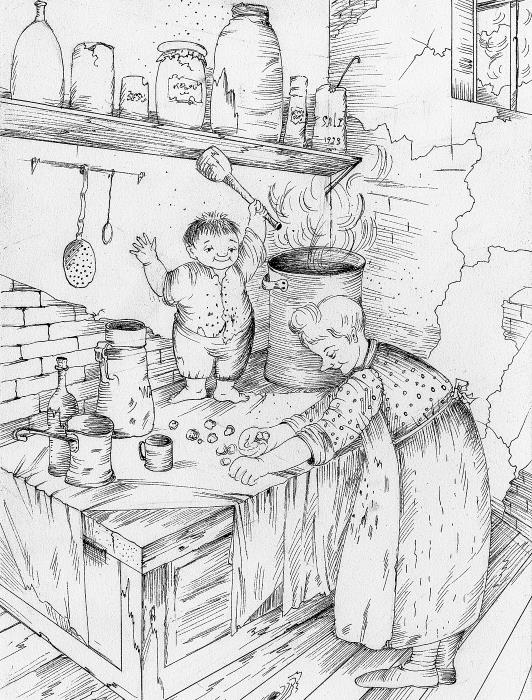 Как-то раз она возилась за кухонным столом – толкла деревянной толкушкой картошку в кастрюле. А обожаемый внучек разгуливал по столу и с любопытством следил за её действиями. Особенно его заинтересовала толкушка.