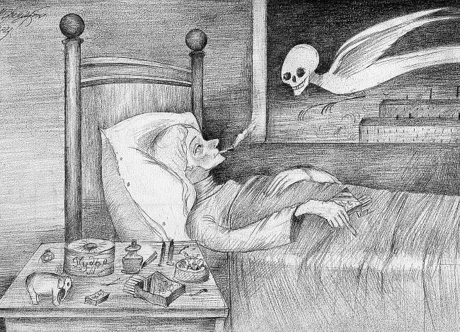 (Мария Памфиловна знала, что умирает от рака горла, но даже когда в одно печальное утро её обнаружили бездыханной, она держала в окоченевших пальцах потухшую папиросу, не донесённую до рта.)