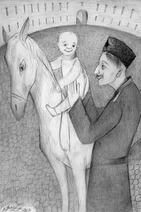 И вот рано утром во дворе московского дома раздался цокот копыт и верхом на холёном коне появился мой отец. Спешившись, принял из рук матери меня и поднёс к голове коня, который стоял смирно и только поводил большим глазом. Я радостно заверещал и потянулся к нему. “Он будет настоящим джигитом!” – громко воскликнул отец, обернувшись к матери, и, водрузив меня на седло, придерживая рукой, трижды провёл коня по кругу, сопровождаемый удивлёнными взглядами жильцов дома, высунувшихся из окон. Так я стал джигитом.