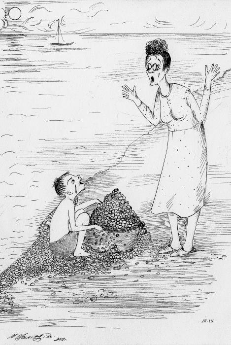 Неизвестный авторЮжный городок у Чёрного моря. Летний солнечный день. Пляж из гальки. У берега моря сидит маленький мальчик, рядом с ним жестяной тазик, который он заполняет круглыми камушками. Таз уже полный, но мальчик упрямо насыпает камушки, они падают, рассыпаются. Чудесных камушков так много, они все такие разные, такие красивые! И надо собрать и забрать все! Мальчик снова кладёт камушки в тазик, они ссыпаются, падают, мальчик снова кладёт камушки в тазик, и они падают, он снова кладёт, и снова падают. От огорчения мальчик безутешно плачет.