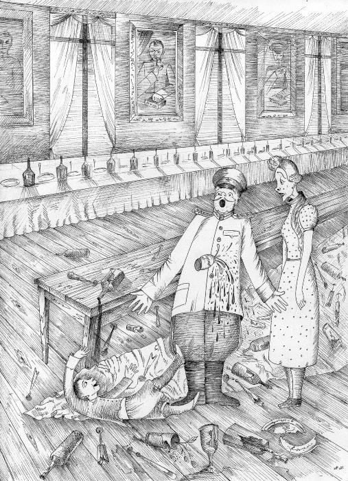Неизвестный авторЛетний вечер. Ресторан для высших чинов Советской армии. Несколько длинных столов посередине большого зала накрыты белыми скатертями, свисающими до пола. На столах столовые приборы, графины с водой.