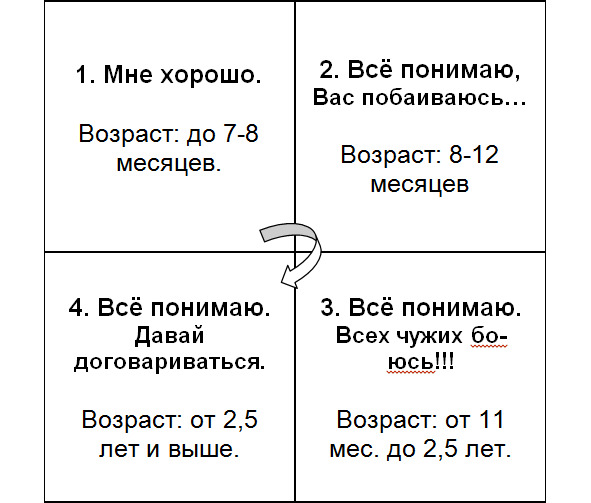 Если родитель выходит из комнаты и ребёнок начинает провожать его взглядом, то задача тренера отвлечь малыша – увлечь его игрушками и голосом, перевести внимание.