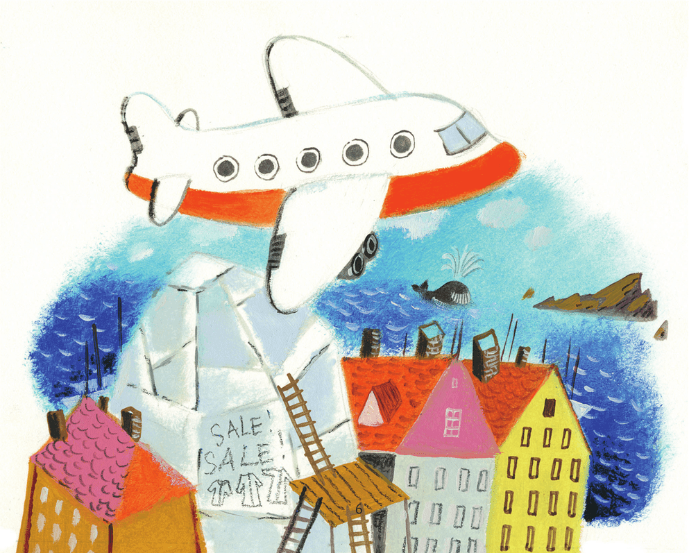 Навстречу мистеру Ларсену шли толпы довольных мужчин, женщин и детей в новой одежде всевозможных цветов и оттенков, и у него даже зарябило в глазах. «Я тоже, – бормотал он себе под нос, – я тоже себе возьму какую-нибудь весёлую расцветку». Но когда он наконец-то доковылял до распродажи, то обнаружил только пустые коробки. Удивительный огромный павильон был разобран, как будто его здесь вообще не было. Как, впрочем, не было ни покупателей, крутящихся перед зеркалами в раздумье, какое же пальто им выбрать, ни прилетающих за ними самолётов.