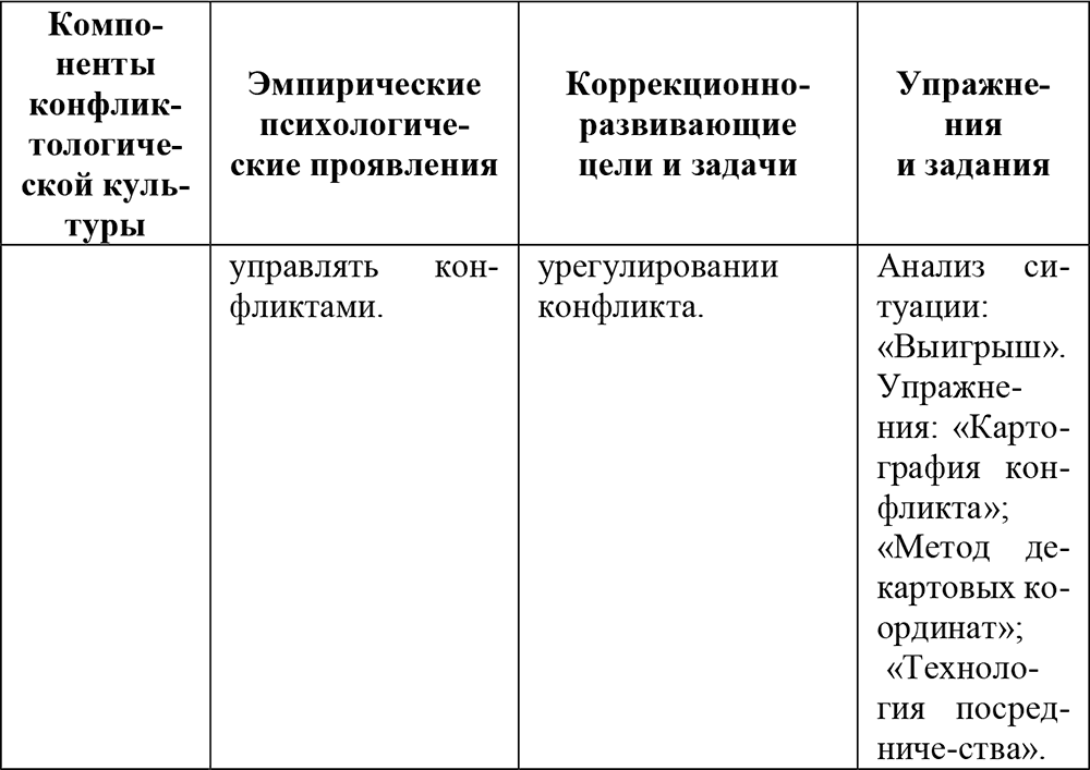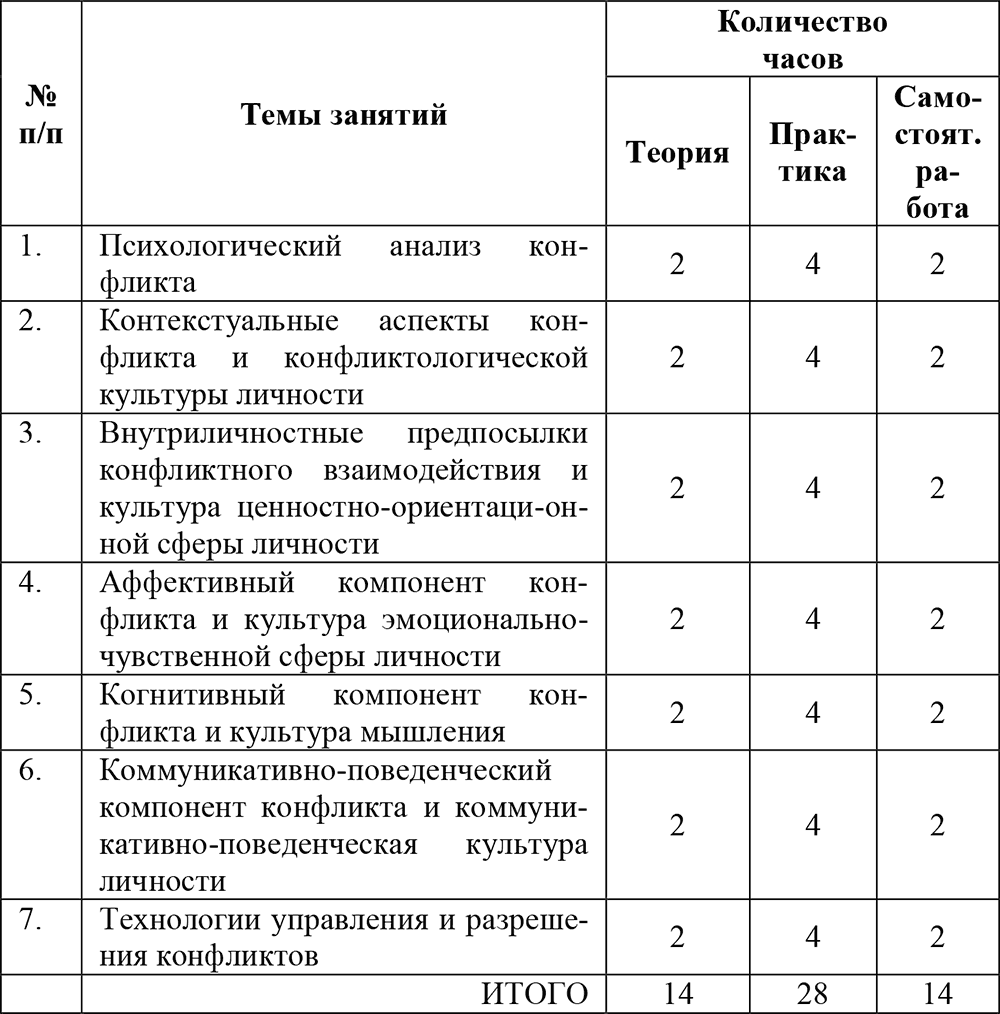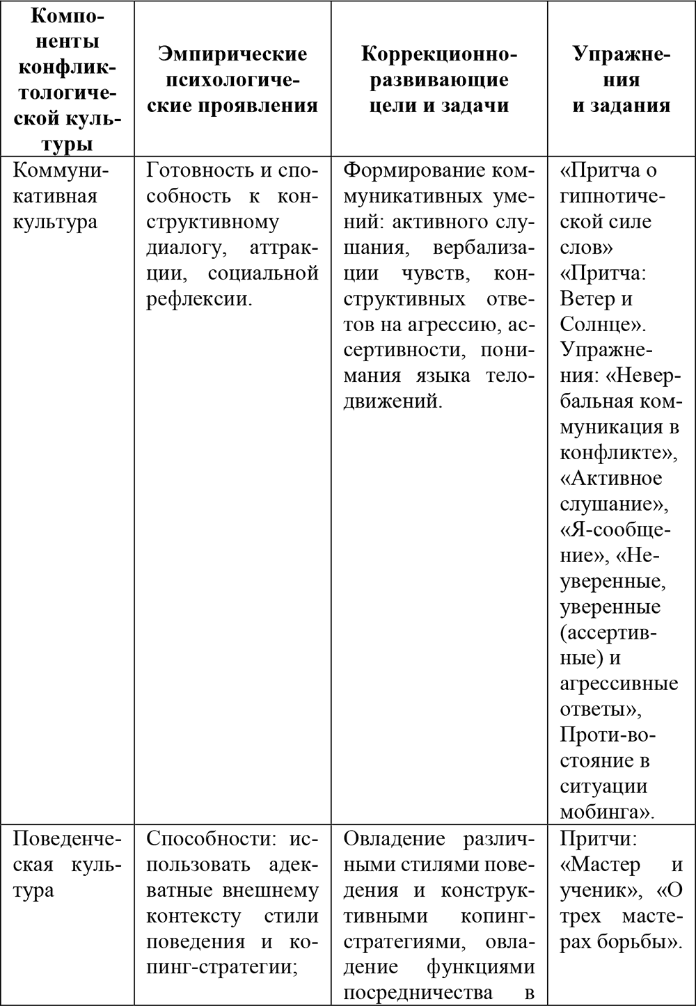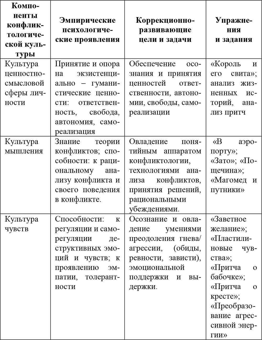 Формирование конфликтологической культуры личности осуществлялось в процессе специально подобранных заданий, упражнений, направленных на развитие психологических составляющих компонентов конфликтологической культуры: культуры ценностно-смысловой сферы; культуры мышления, культуры чувств, коммуникативной культуры, поведенческой культуры. В ходе тренинга использовались психокоррекционные и психоразвивающие процедуры и техники, основанные на гуманистически-ориентированных и когнитивно-бихевиоральных концепциях психологической помощи (К. Роджерс, Ф. Перлз, Н. Пезешкиан, А. Эллис и др.). Программа тренинга представлена в Приложении 1.