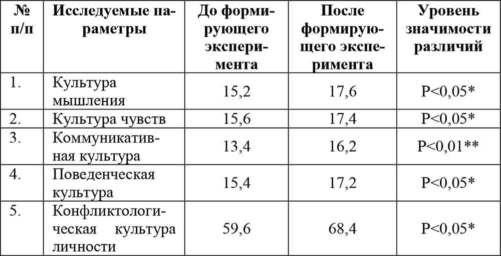 Проведение нами в последующем формирующего эксперимента со студентами позволило повысить у студентов не только уровень конфликтологической культуры, но получить значимые различия и по ряду других исследуемых параметров (табл. 28).