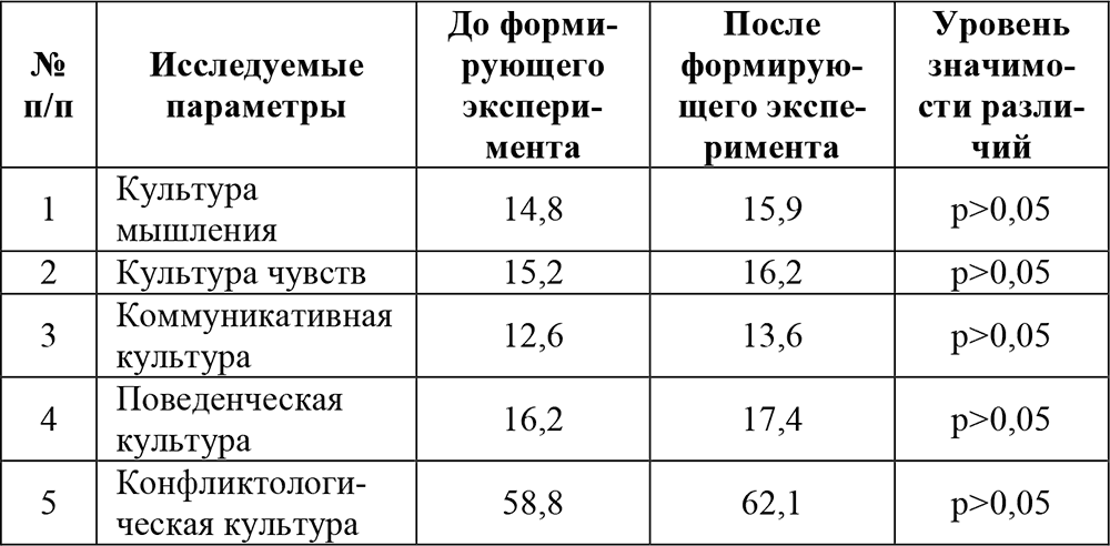 Из табл. 29 следует, что в результате формирующего эксперимента у студентов экспериментальной группы изменились все компоненты конфликтологической культуры личности.