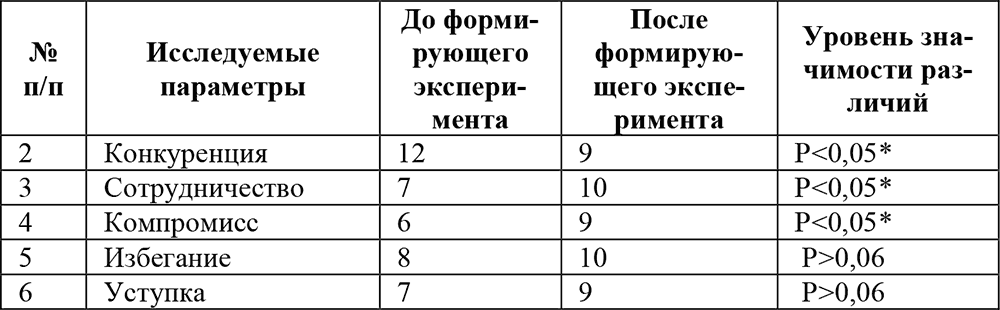 Проведенное исследование показало, что в экспериментальной группе произошли значимые изменения по трем шкалам. В результате формирующего эксперимента у испытуемых уменьшился уровень конкуренции, повысился уровень сотрудничества, повысился уровень компромисса. Не изменились значимо показатели избегания и уступки. В то же время по итогам формирующего эксперимента в целом уменьшился разброс в показателях по всем шкалам, то есть испытуемые проявляли в равной степени показатели по всем шкалам.