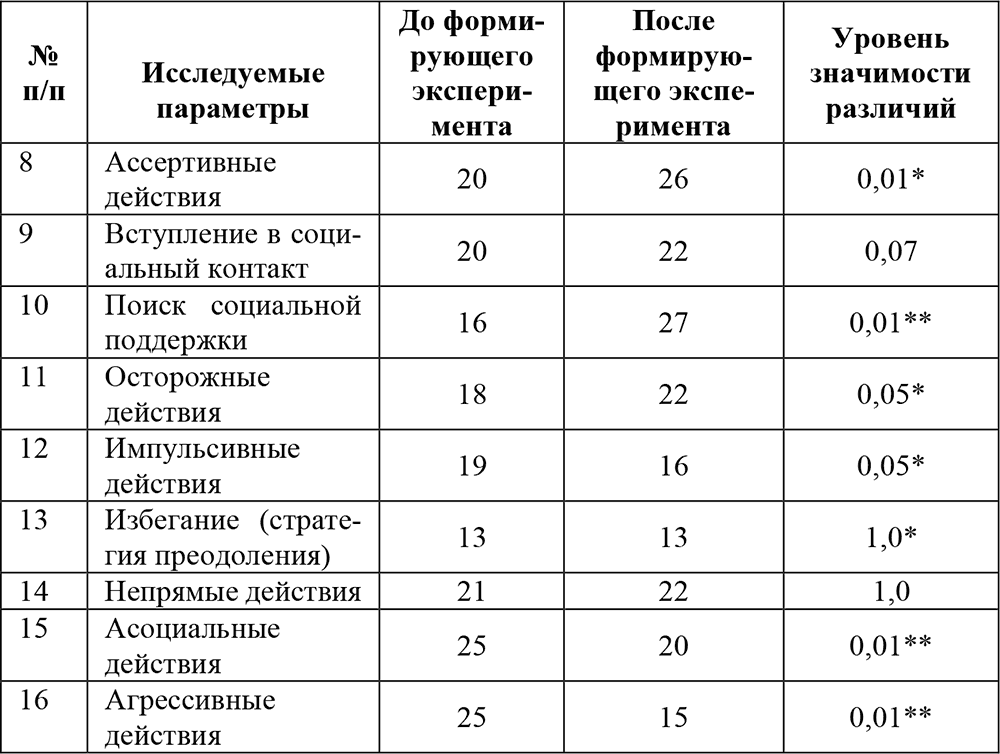 Из табл. 31 следует, что у студентов после формирующего эксперимента значимо возросли следующие показатели: уровень конфликтологической культуры, стиль сотрудничество, компромисс, ассертивные действия, поиск социальной поддержки, осторожные действия, Уменьшились значимо следующие показатели: импульсивные действия; асоциальные действия, агрессивные действия. Не выявлено значимых различий по следующим показателям: самоэффективность, избегание – как стратегия преодоления, непрямые действия.