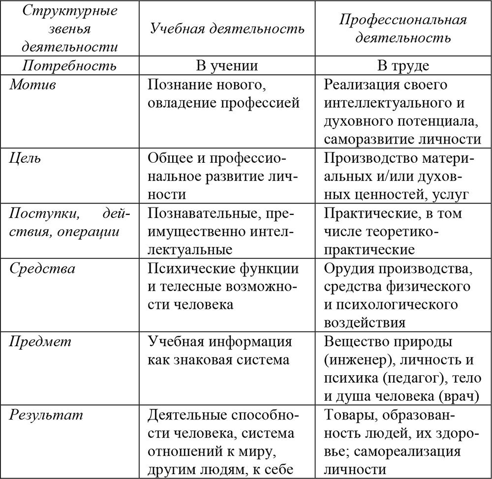 Таблица 1. Отличия в содержательном наполнении структуры учебной и профессиональной деятельности