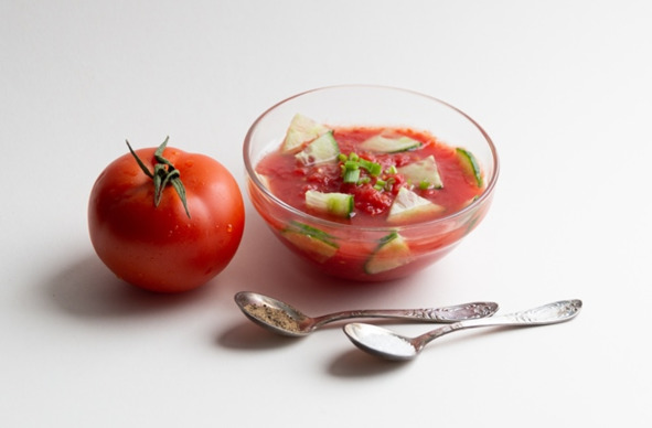 Суп гаспачо придумали испанцы, перетирая имеющиеся в наличии овощи (преимущественно томаты), смешивая их со специями, льдом, чем-нибудь кислым (уксус или лимонный сок), зеленью, добавляя оливковое масло, подавая с белым хлебом.