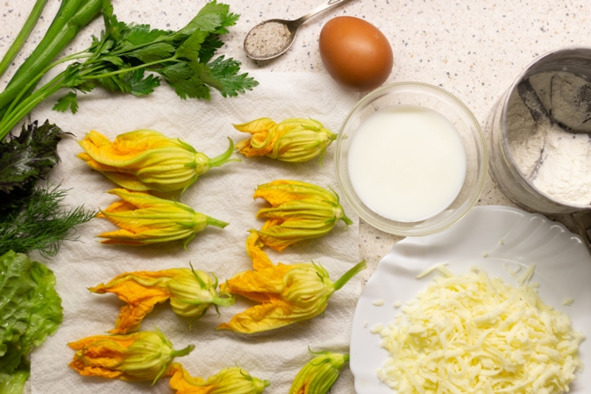 8 цветков кабачка50 г сыра50 г зелени1 зуб чеснока1 яйцо100 мл молока50 г мукисоль, перец