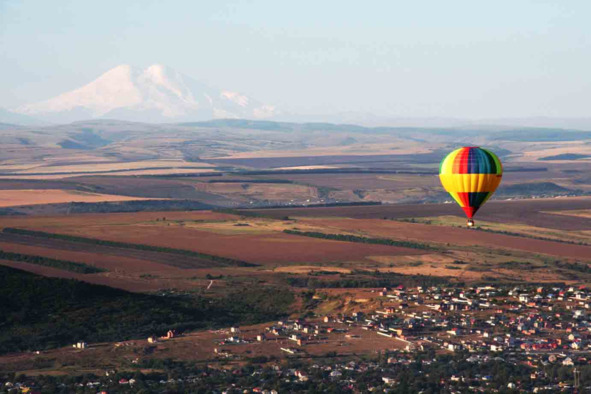 И мы, плавно разворачиваясь, двигались в сторону Эльбруса – заснеженный красавец предстал во всей красе среди бескрайних полей и холмов. Проплыли над футбольным полем, загоравшие подростки нам помахали. Созерцали ипподром с маленьким прудом. Утопающие в зелени садов домики и церковь. Речка Покумок с каменистыми берегами.