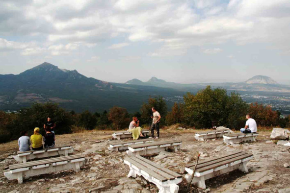 Посидела на лавочке, любуясь Бештау с Верблюдом. Дошла до самого верха, куда приезжают вагончики, купила воды. В ресторане спросила у местных ребят, не знают ли они тропу, ведущую к Провалу? Сказали, что такой нет. Попросила пожилую пару меня сфотографировать на великолепном фоне Пятигорска.