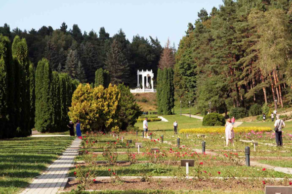 Вид на город и горы за ним открывался замечательный. Полюбовалась, прочла статью о природном камне доломите, участвующем в местной застройке, и зашагала по парковым дорожкам, наслаждаясь хвойным запахом деревьев. Шла наугад, радуясь встречающимся интересностям. Можно было покататься верхом. Попался барельеф Ленина и его высказывание о минеральных водах. Потом был огромный камень, с сидящим наверху символом КМВ – орлом, поражающим змею. Рядом примостилась девушка в позе лотоса, делающая селфи. Повстречала белку и дам, порекомендовавших мне идти выше и ниже – везде красиво. Отправилась по ступеням вверх, луговой тропинкой дошла до видовой площадки, напоминающей одновременно автобусную остановку и летающую тарелку, исписанную инопланетными надписями. Дух захватывало от окрестных пейзажей.