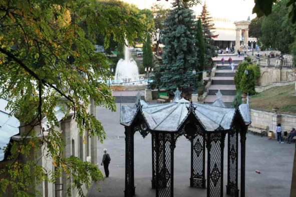 Дошла до пешеходного Курортного бульвара, где беспечно улыбались «измученные» нарзаном люди. Посмотрела на здания ванн, выпила разных видов минералки в обширном прохладном мраморном бювете с изящными извечными античными статуями. Сфотографировалась около колоннады, прошлась по тенистой аллее, прочитала стихи на памятнике Лермонтову. Уточнила у скверных (дело было в сквере) художников, как попасть в парк, и зашагала назад к вокзалу, а оттуда стала подниматься вверх мимо ресторанчиков и сувенирных лавок. Свернула и неожиданно оказалась у подножия грандиозной каскадной лестницы с цветами, фонтанами и колоннадой наверху.