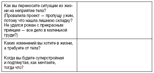 «Я благодарю тебя, мое тело, что ты мне показываешь, какие у меня есть проблемы. Благодарю тебя за то, что вместо страшных болезней (рак, диабет и т. п.) ты весь мой эмоциональный мусор трансформируешь в обычный жир и лишние объемы. Я благодарю тебя за то, что, несмотря на наличие лишнего веса, ты красивое: большая грудь, округлые бедра, нежная, красивая кожа. И позволяешь мне в одежде выглядеть очень даже ничего!»