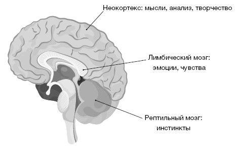 Инстинкт, в свою очередь, – это стремление к удовлетворению основных потребностей (еда, размножение, самосохранение, защита и т. д.). Рептильный мозг стоит на страже и оберегает нас тогда, когда нам нужны наши инстинкты (в том числе на уровне «дотронулся до чайника – отдернул руку»). Мы практически не можем его контролировать.