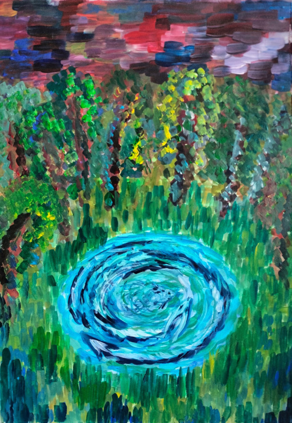 – Ты протягиваешь руку над озером, и карп, к твоему удивлению, подплывает достаточно близко, чтобы ты могла до него дотронуться. Но гладить его оказалось не особенно приятно – ты немного поводила рукой вдоль грубой, шершавой чешуи. Слизь, как у обычных рыб, ее не покрывает. Чешуя обдает тебя странным, почти что морозным холодом. После того как ты его «погладила», житель озера вернулся к своему прежнему занятию, вырисовывая загадочные символы в воде.