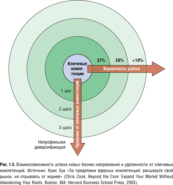 Анализ, проведенный Зуком и Алленом, показал, что в случае одного шага в сторону от основного бизнеса вероятность успеха составляет порядка 37 %, что превышает 30 %, являющиеся средней вероятностью успеха при запуске новых бизнес-направлений. Второй «шаг в сторону» снижает вероятность успеха до 28 %. И для новых направлений, которые отделены от ключевых компетенций тремя шагами в сторону, уровень успеха падает ниже 10 % (рис. 1.5).