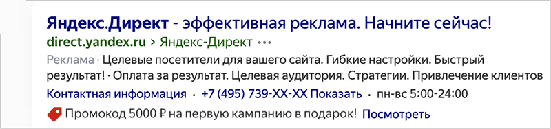 Промоакция – новый инструмент Директа, с помощью которого в текст объявления можно добавить упоминание акции. Она выделяется красным значком скидки и привлекает внимание потенциальных покупателей. Промоакция отображается только в объявлениях на первой позиции.