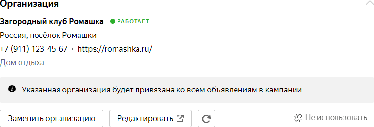 Карточка организации – альтернатива виртуальной визитке (о виртуальной визитке подробнее написано ниже). Автоматически или вручную подтягивается в Директ, если организация зарегистрирована на Яндекс. Картах или Яндекс Бизнесе.