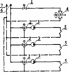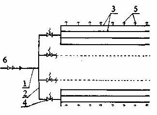 – магистральный; 2 – распределительный; 3 – подводящий пластмассовый; 4 – магнитный клапан; 5 – форсунка; 6 – вода (питательный раствор).
