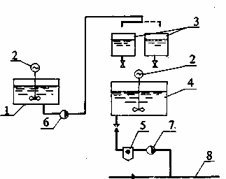 – резервуар для растворения удобрений; 2 – смесители; 3 – емкости для дозировки компонентов; 4 – бак с рабочим раствором; 5 – фильтр; 6 – насос для заполнения емкости 3; 7 – дозировочный насос; 8 – магистральный трубопровод системы.