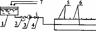 1 – дозатор (а – головка, б – резервуар); 3 – регулятор давления; 4 – магнитный клапан; 5 – капельница; 6 – пластмассовый разводящий трубопровод; 7 – вода.