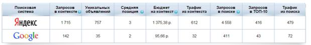 Сервис позволяет проанализировать эффективность SEO и контекстной рекламы вас и ва-ших конкурентов. Сервис выводит все необходимые для анализа данные отдельно для поис-ковой систем «Яндекс» и Google: количество запросов в контексте, количество уникальных объявлений в контексте, среднюю позицию, бюджет на контекст, трафик из контекста, коли-чество запросов в поиске, запросов в ТОП-10 и др.