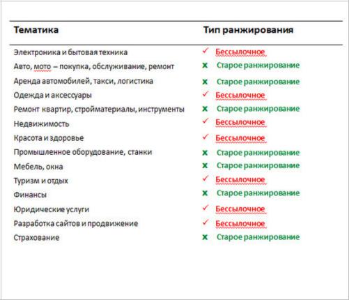 Рисунок 63. Тематики, в которых, по заявлению представителей «Яндек-са», отключили ссылочное ранжирование