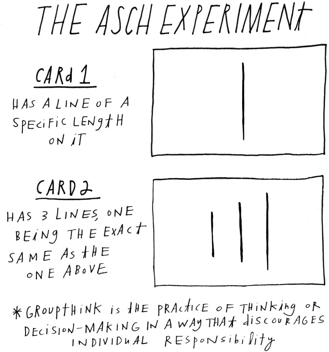 In the 1950s Solomon Asch gathered groups of college students and told them they were doing a vision test. The catch was that in each group, everyone was an actor except one person: the subject of the test.