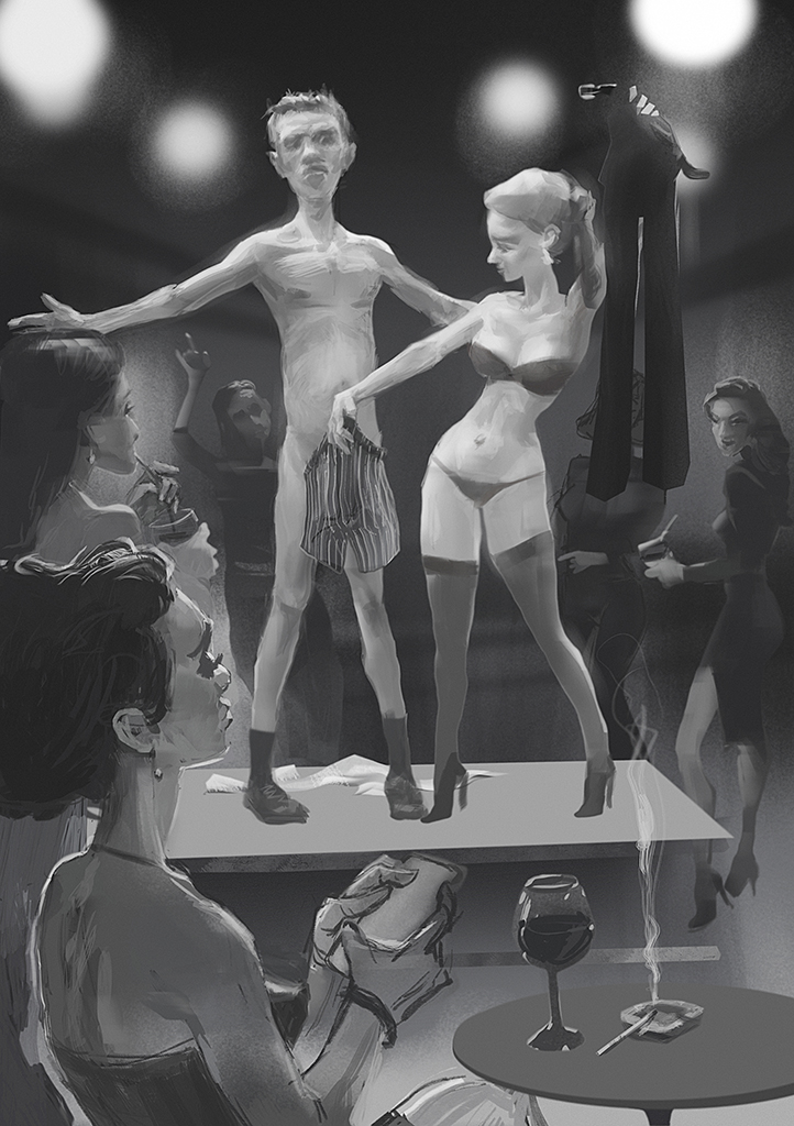 Там ведь как получилось? В «Боинге» в тот вечер, как вы уже, наверное, поняли, давали стриптиз. Ну, мне на стриптиз – в рамках моей концепции отсутствия в мире женщин – было махать рукой, я мрачно сидел за столиком и интеллигентно пил водку. Грамм 400 уже выжрал к тому моменту в одно интеллигентное рыло.
