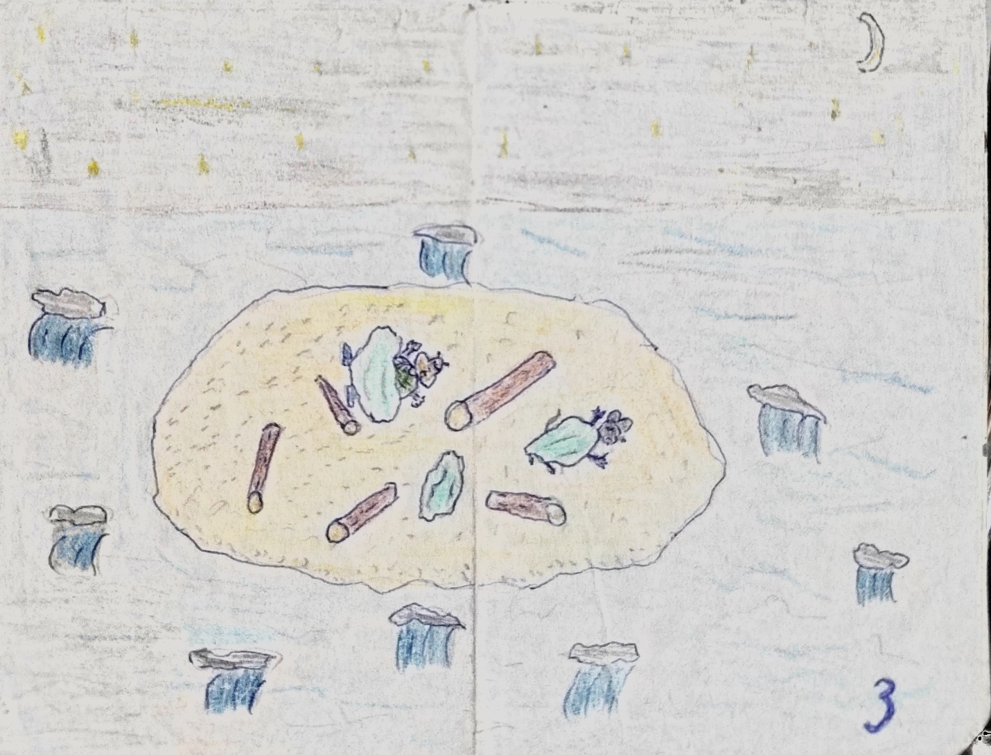 Их понесло течением и выбросило на берег. Они так устали, что уснули прямо так на песке, укрывшись листиками. На утро, когда они проснулись, было утро… Они огляделись и поняли, что находятся на пустынном островке, а вокруг острова море, волны, да и только… На островке было шесть бревен… Малыши очень хотели есть… Они решили сделать плот. Ребята сложили рядом бревна и скрепили их веревкой. Поставили плот на воду и поплыли.