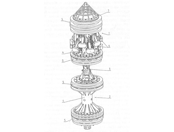 Рис. 20. Общий вид двухсекционного очистного устройства повышенной эффективности, где 1 – головная секция; 2 – хвостовая секция; 3 – карданный шарнир; 4- полый корпус; 5 – блоки из очистных дисков; 6 – очистной узел; 7 – бампер.