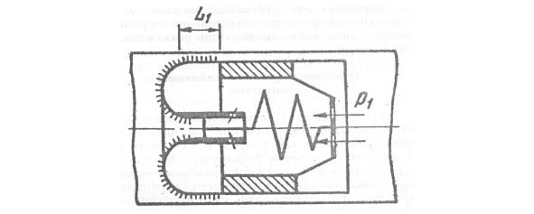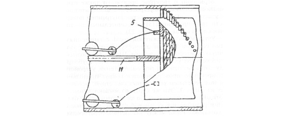 Для увеличения дальности обнаружения места нахождения устройства в очищаемом трубопроводе, Вершинин и Негердус [14] предлагают использовать массивный диск 7, прикрепленный посредством полосы 6 из пружинящего материала к тыльной стенке устройства (Рис.21).