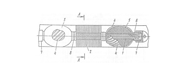 Рис. 21. Продольный разрез очистного устройства с шумовым сигнализатором, где 1 – корпус; 2 – сквозной канал; 3 – спиральная щетка; 4 – эластичный диск; 5 – тыльная стенка корпуса; 6 – полоса; 7 – массивный диск; 8 лопасть; 9 – штырь; 10 – ролик.