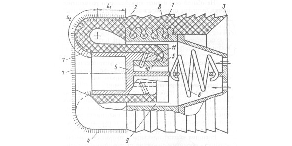 Рис. 25. Конструкция саморегулирующегося очистного устройства, где. 1 – цилиндрический корпус; 2 – надувная оболочка; уплотняющая кромка; 4 – скребковые элементы; 5 – стакан; 6 – пружина; 7 – дополнительные скребки; 8 – наружная часть оболочки; 9 – канал; 10 – рукав; 11 – сопла.