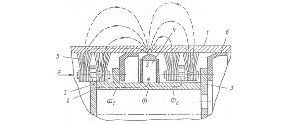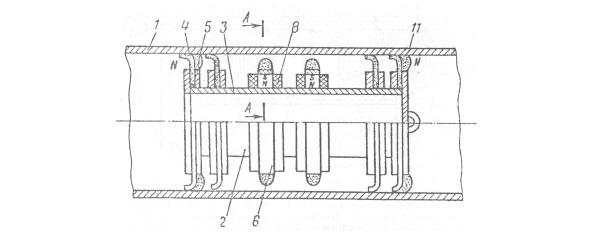 Рис. 28. Продольный разрез очистного устройства из магнитопроводных материалов, где 1 – трубопровод; 2 – магнитопроводный корпус; 3 – фланцы; 4 – постоянные магниты-датчики; 5 – щетки из магнитопроводного материала; 6 – уплотнительные манжеты.