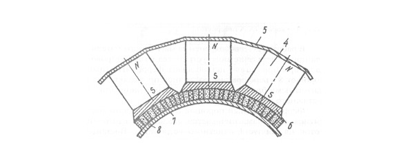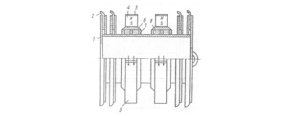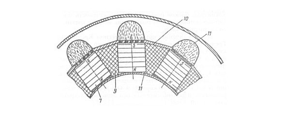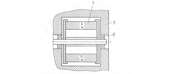 Рис. 33. Поперечный разрез генератора переменного магнитного поля, см. Рис. 32, где 7 – магнитный ротор; 8 – подшипники; 9 – корпус (А-А повернуто).