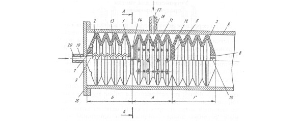 Рис. 36. Общий вид устройства для чистки продуктопроводов, где 1 – гофрированный цилиндр; 2, 3 – торцевые крышки; 4, 5 – перегородки; 6 – камера запуска; 7, 8 – штуцера; 9, 10 – резьбовые отверстия; 11, 12, 14 – сквозные отверстия; эластичная трубка; 15 – пазы; 16 – крышка; 17, 19 – отверстия; 18, 20 – штуцера.