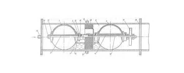 Устройство трогается с места, причем в момент трогания устройства с места, вследствие сжатия гофр секции «В». Часть рабочей среды через эластичную трубку 13, отвор перегородки 4, пазы 15 в выступах гофр секции «В» поступает в пространство трубы вокруг этой секции, а по отверстиям 11 в самую полость «В».