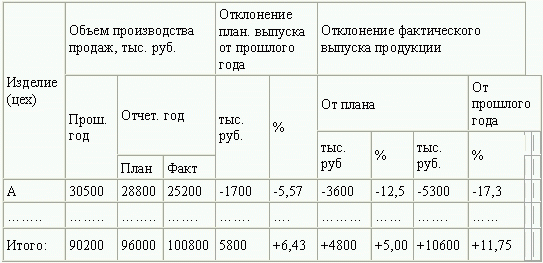 В приведенном примере отклонение фактического выпуска товарной продукции от прошлого года имеет небольшую величину +11,75 %, а фактического выпуска от плана всего 5 %.