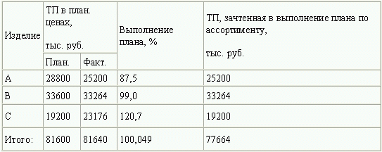 При этом изделия, выпускаемые сверх плана или не предусмотренные планом, в расчет выполнения плана по ассортименту не принимаются. План по ассортименту считается выполненным только в том случае, если выполнено задание по всем видам изделий. План по ассортименту по рассматриваемом пример не выполнен.