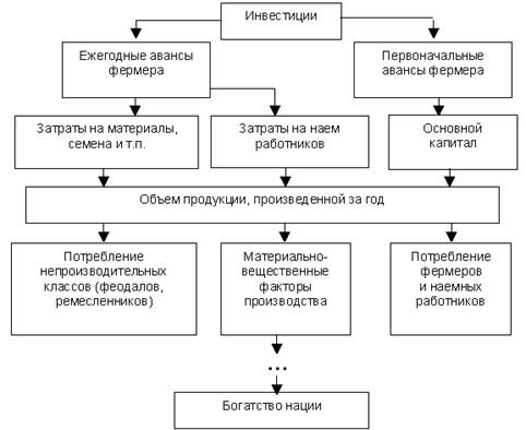 С большей определенностью процесс инвестирования проанализирован представителями учения физиократов. Ф. Кэне, автор «Экономической таблицы», впервые определил натурально-вещественную структуру инвестиций, подразделив их на «avances primities» и «avances annuelles», т. е. первоначальные и ежегодные авансы. Под первоначальными авансами понимались затраты на приобретение сельскохозяйственных машин, построек, рабочего скота. Эти затраты представляют собой, по определению Ф. Кэне, фонд земледельческого оборудования, время оборота которого составляло 10 лет. Ежегодные авансы состоят из затрат на семена, найм сельскохозяйственных рабочих и других подобных издержек, которые требуют ежегодного возобновления. Кэне полагал, что в ежегодные издержки входит 1/10 часть первоначальных авансов и полностью авансы ежегодные.