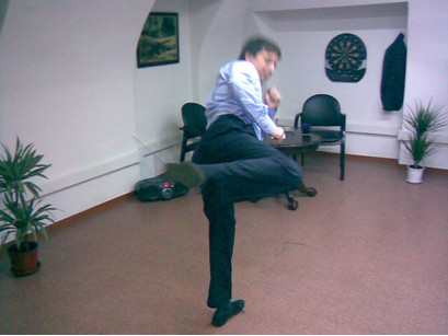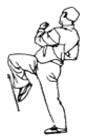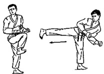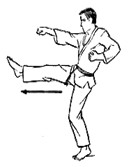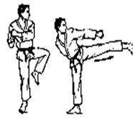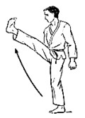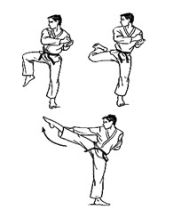 Левая стопа на месте или скользит вперед на пол-шага. Центр тяжести тела перенести вперед на левую ногу, согнутую в колене. Правую ногу, согнутую в колене, поднять, голень развернуть наружу, носок также наружу. Распрямляя колено, нанести удар вперед-вниз до уровня колена. Усилие направить к внешнему краю стопы.