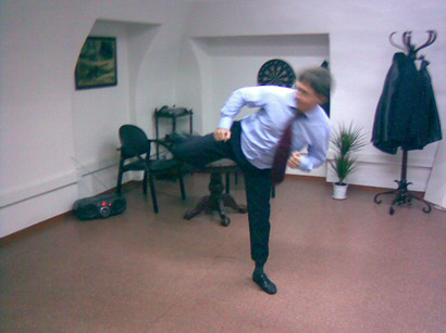 Удар наносится в колено, пах, корпус и лицо.