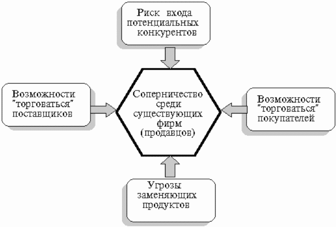 Портер предложил для этого модель пяти сил (рис. 9). Он аргументировал эту модель тем, что чем выше давление этих сил, тем меньше у существующих компаний возможности увеличивать цены и прибыль. Ослабление сил создает благоприятные возможности для компании. Компания, изменив свою стратегию, может воздействовать на эти силы в свою пользу.