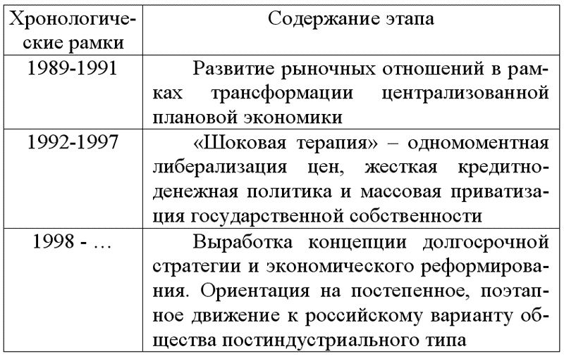 Предпосылками современной экономической реформы в России можно считать попытки трансформации централизованной плановой экономики, получившие название «перестройки» (весна 1985 г. – август 1991 г.), когда были сделаны первые шаги в сторону реальной рыночной экономики. При этом главной задачей считалась коренная реконструкция народного хозяйства на основе научно-технического прогресса, с глубокими структурными сдвигами в общественном производстве, с радикально реформой хозяйственного механизма, способной придать социализму новое качество. В развитии современной экономической реформы в России, связанной с попыткой построения рыночной системы, можно выделить несколько этапов (см. таблицу 1)